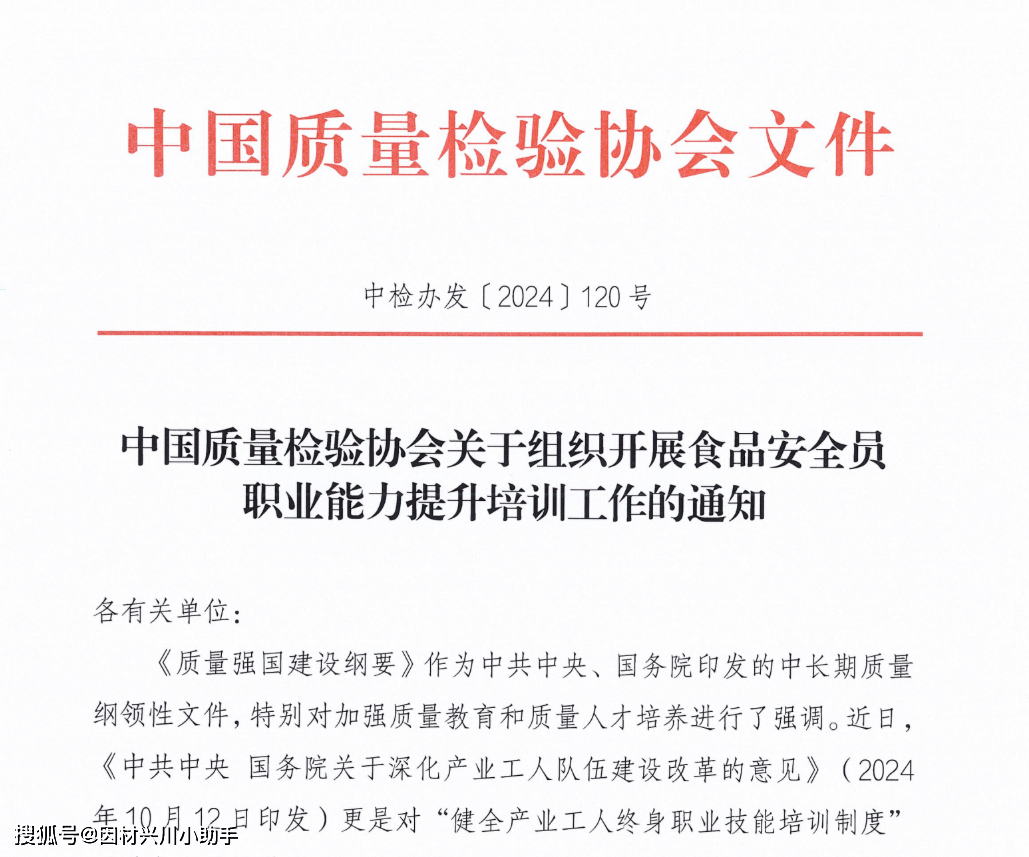 按照《食物平安法》、《劳动法》等法令律例的,按关决策摆设和《企业落实食物平安从体义务监视办理》(市场监管总局令第60号)等从管部分的政策要求,为了深切贯彻落实新时代人才强国计谋,督促泛博企业和查验检测机构提拔承担质量平安从体义务的能力,引领食物平安员精确把握其职责和权限并持续提拔岗亭履责能力,持续深切贯彻落实食物平安工做“四个最严”的要求,出力阐扬质量查验行业组织正在“党委带领、从导、政策支撑、企业从体、社会参取”高技强人才工做系统中不成或缺的积极感化,合力推进质量社会共治,指导企业加强质量工做,推进企业产物和办事质量提拔,充实阐扬食物平安员正在产质量量提拔中的主要感化,办事高质量成长,推进质量强国扶植,中国质量查验协会组织开展食物平安员职业能力提拔培训工做。