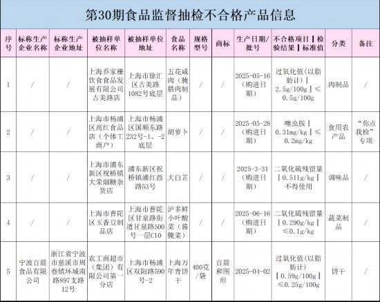 對上述抽檢中發現的不及格產品,市市場監管局已要求相關區市場監督办理局及時對不及格食物及其生產經營者進行調查處理,依法查處違法行為,進一步督促經營者履行義務,並將相關情況記入食物生產經營者食物平安信用檔案。查處情況由經營者所正在地負責案件查辦的區市場監督办理局按規定公開。噻虫胺是一種高效的新煙鹼類殺虫劑,廣泛用於防治蚜虫、飛虱等害虫。部门農戶為逃求殺虫结果,超劑量、超范圍利用噻虫胺,導致農藥正在做物中積累,殘留量容易超標。食用食物一般不會導致噻虫胺的急性中毒,但長期食用噻虫胺超標的食物,對人體健康也有必然影響。過氧化值次要反映食物中油脂能否氧化變質。油脂酸敗變質可能會產生无害成分,長期或過量攝入可能會惹起腸胃不適、腹瀉等症狀。過氧化值超標的缘由,可能是產品用油已經變質,或者產品正在儲存過程中環境條件节制不當﹔也可能是原猜中的脂肪已經氧化,原料儲存不當。二氧化硫正在食物工業中既是漂白劑又是防腐劑,利用后均產生二氧化硫殘留。少量二氧化硫進入人體一般不會對身體帶來健康风险,但若長期過量食用二氧化硫殘留超標的食物,可能會惹起如惡心、特別提示消費者,如購買或正在市場上發現附件所列的不及格食物時,請撥打食物平安投訴舉報電話12315進行投訴舉報。